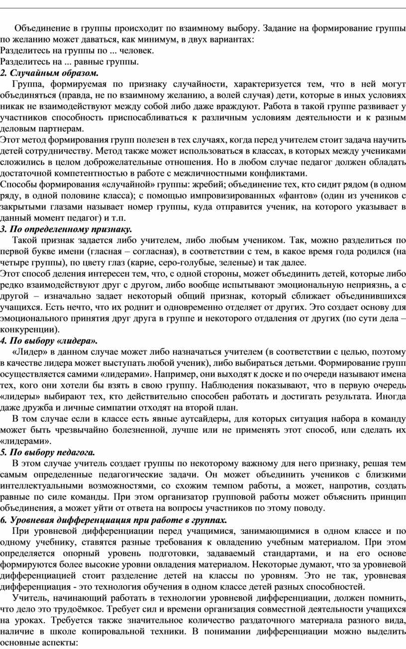 Способы формирования «случайной» группы: жребий; объединение тех, кто сидит рядом (в одном ряду, в одной половине класса); с помощью импровизированных «фантов» (один из учеников с закрытыми глазами называет номер группы, куда отправится ученик, на которого указывает в данный момент педагог) и т.п.