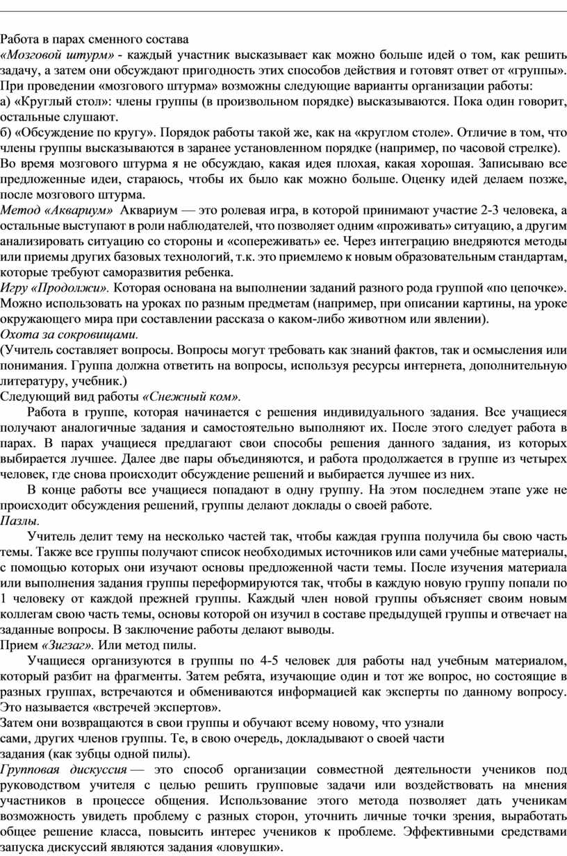 Одной из главных задач совершенствования системы школьного образования является создание условий для самореализации и развития обучающихся. Личность, способная себя реализовать, востребована в современном обществе, что отмечено в нормативно-правовых документах, определяющих образовательную политику государства: Законе Об образовании в РФ, Федеральном государственном образовательном стандановного общего образования, Концепции духовно-нравственногорте ос развития и воспитания личности гражданин России. Большое значение в современной педагогической науке отводится интерактивным методам обучения, так как они ориентированы на активную совместную учебную деятельность и позволяют выстроить образовательное пространство для самореализации обучающихся. Работа в малых группах - неотъемлемая часть многих интерактивных методов, так как она дает обучающимся, в том числе и стеснительным, возможность участвовать в работе, практиковать навыки сотрудничества, межличностного общения.