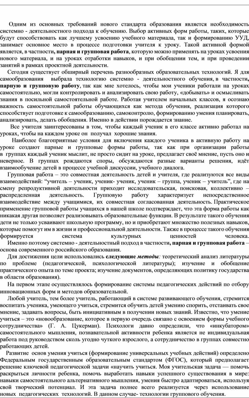 Одним из основных требований нового стандарта образования является необходимость системно - деятельностного подхода к обучению. Выбор активных форм работы, таких, которые будут способствовать как лучшему усвоению учебного материала, так и формированию УУД, занимает основное место в процессе подготовки учителя к уроку. Такой активной формой является, в частности, парная и групповая работа, которую можно применять на уроках усвоения нового материала, и на уроках отработки навыков, и при обобщении тем, и при проведении занятий в рамках проектной деятельности.
