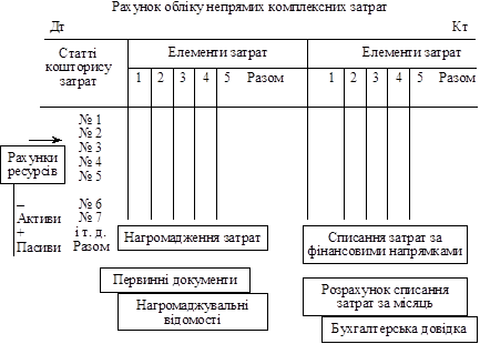 Незважаючи на різні за змістом затрати ці проміжні комплекси формуються та облікуються за єдиним зразком. Спочатку затрати у розрізі елементів облікуються по кожній статті номенклатури кошторису, виду затрат, а потім на підставі відповідного параметру (ознаки) розподіляються за напрямками. Загальну побудову їх обліку унаочнює рис. Б.2.18.