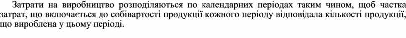 Затрати на виробництво розподіляються по календарних періодах таким чином, щоб частка затрат, що включається до собівартості продукції кожного періоду відповідала кількості продукції, що вироблена у цьому періоді.