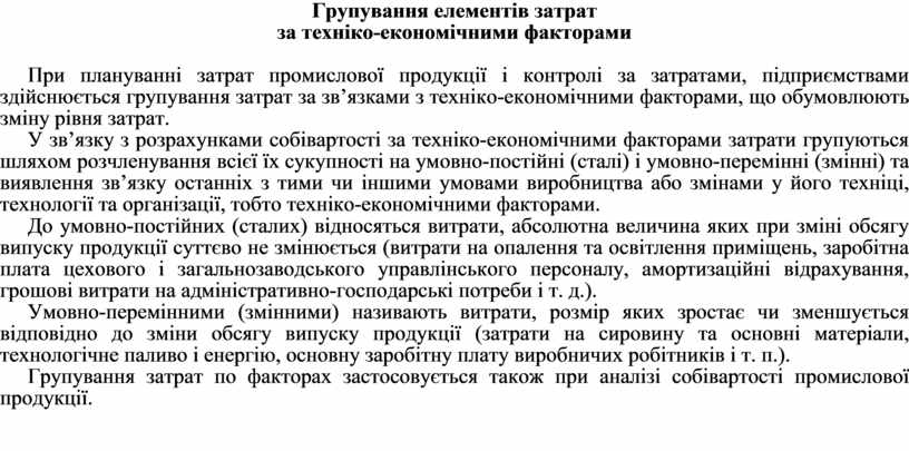 При плануванні затрат промислової продукції і контролі за затратами, підприємствами здійснюється групування затрат за зв’язками з техніко-економічними факторами, що обумовлюють зміну рівня затрат.