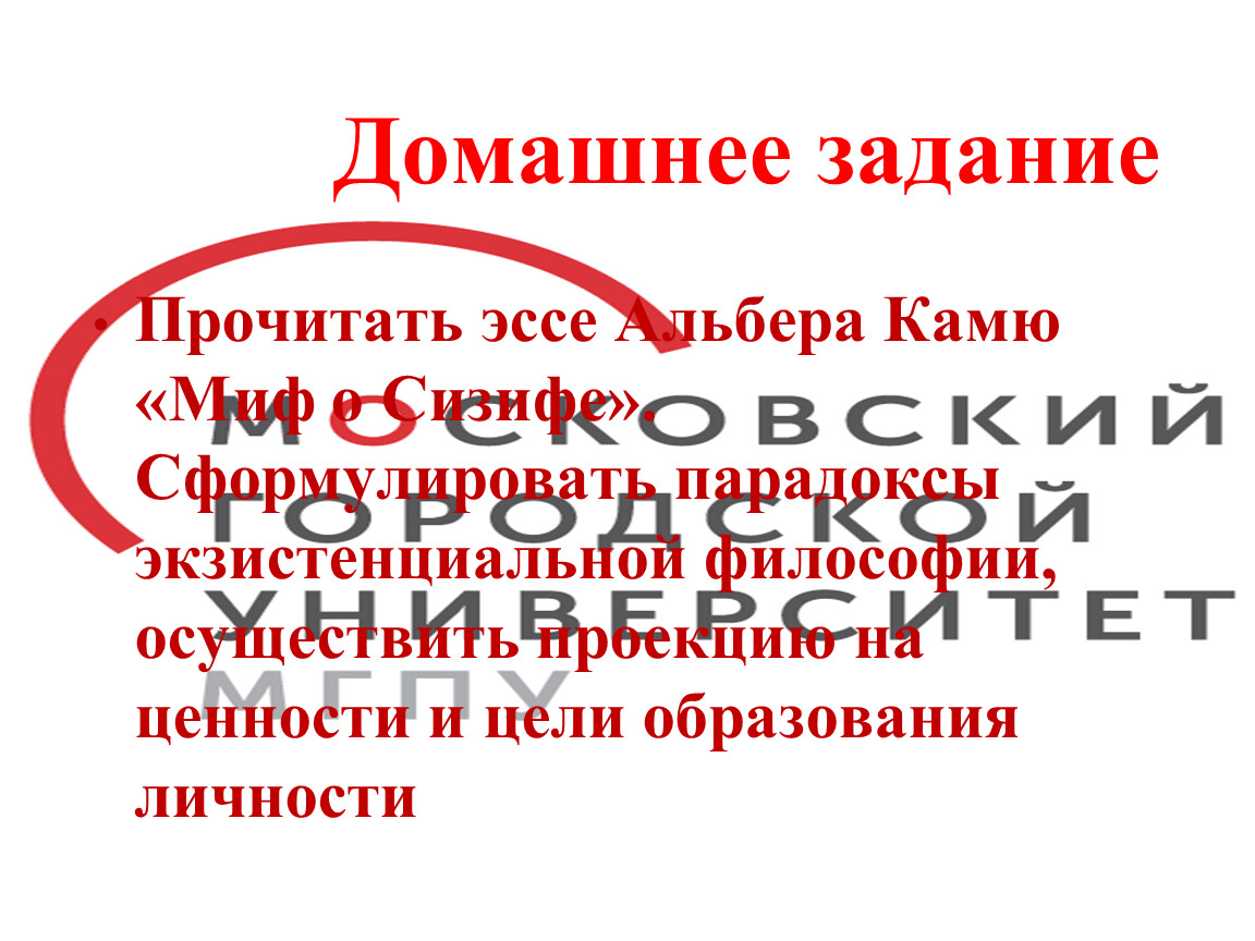 Прочитать эссе Альбера Камю «Миф о Сизифе». Сформулировать парадоксы экзистенциальной философии, осуществить проекцию на ценности и цели образования личности