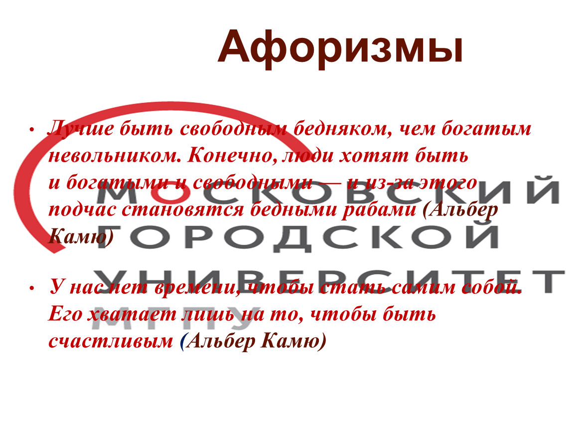 Лучше быть свободным бедняком, чем богатым невольником. Конечно, люди хотят быть и богатыми и свободными — и из-за этого подчас становятся бедными рабами (Альбер Камю)