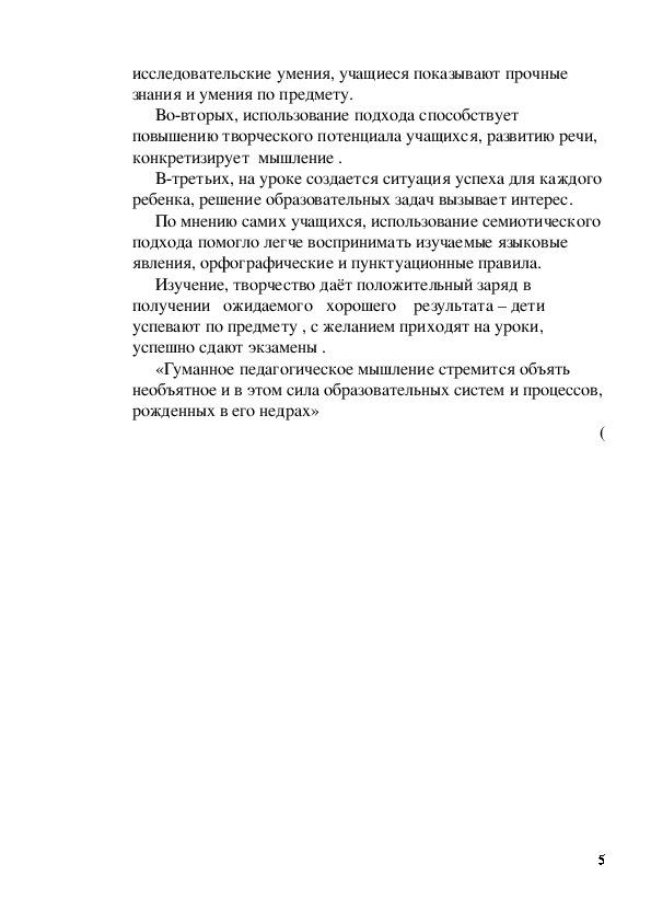 «Гуманная педагогика : реализация семиотического подхода», Выступление на областном методическом дне.Гуманная педагогика - это педагогика сотрудничества, ориентированная на личность ребёнка, на его индивидуальные образовательные потребности, она принимает классическую формулу: ребёнок не готовится к жизни, он уже живёт.Слово "гуманизм" в переводе с латинского языка означает человечный. Учитель излучает человеческую доброту, без которой невозможно воспитывать гуманную душу в человеке. Гуманная педагогика не предполагает грубости, давления, ущемления достоинства, игнорирования жизни ребёнка, а за счёт дифференциации образовательного процесса стимулирует саморазвитие личности детей по направлениям: организация самопознания; организация самовоспитания; нацеленность на результаты деятельности. Обращение к чувству собственного достоинства, пробуждение самолюбия нацеливают учащихся на самообразование и самосовершенствование, самостимуляцию волевых усилий: «Я могу всё сделать!» , «Я верю в себя!», «У меня всё получится!»