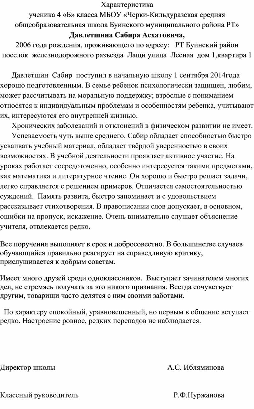 Давлетшин Сабир поступил в начальную школу 1 сентября 2014года хорошо подготовленным. В семье ребенок психологически защищен, любим, может рассчитывать на моральную поддержку; взрослые с пониманием относятся к индивидуальным проблемам и особенностям ребенка, учитывают их, интересуются его внутренней жизнью.
