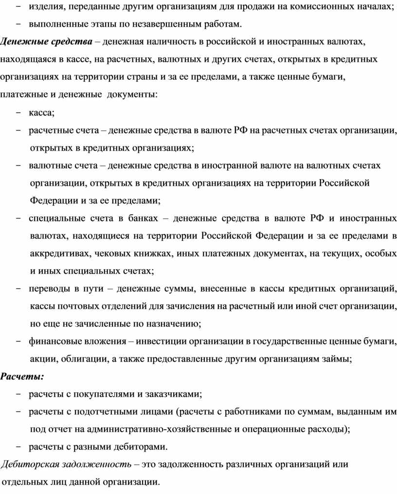Денежные средства – денежная наличность в российской и иностранных валютах, находящаяся в кассе, на расчетных, валютных и других счетах, открытых в кредитных организациях на территории страны и за ее пределами, а также ценные бумаги, платежные и денежные документы: