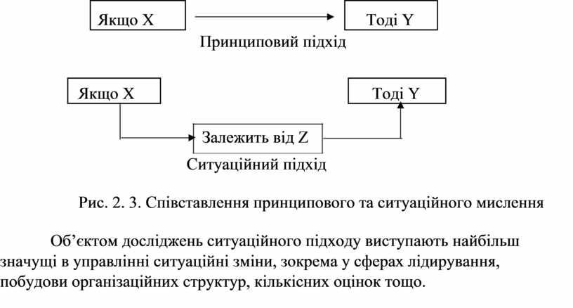 Сутність ситуаційного підходу можна краще усвідомити у процесі співставлення принципового та ситуаційного мислення.