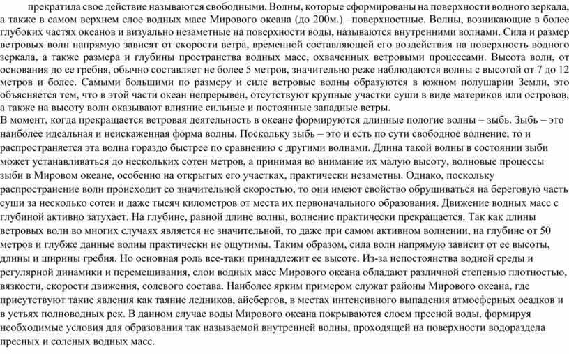 В момент, когда прекращается ветровая деятельность в океане формируются длинные пологие волны – зыбь. Зыбь – это наиболее идеальная и неискаженная форма волны. Поскольку зыбь – это и есть по сути свободное волнение, то и распространяется эта волна гораздо быстрее по сравнению с другими волнами. Длина такой волны в состоянии зыби может устанавливаться до нескольких сотен метров, а принимая во внимание их малую высоту, волновые процессы зыби в Мировом океане, особенно на открытых его участках, практически незаметны. Однако, поскольку распространение волн происходит со значительной скоростью, то они имеют свойство обрушиваться на береговую часть суши за несколько сотен и даже тысяч километров от места их первоначального образования. Движение водных масс с глубиной активно затухает. На глубине, равной длине волны, волнение практически прекращается. Так как длины ветровых волн во многих случаях является не значительной, то даже при самом активном волнении, на глубине от 50 метров и глубже данные волны практически не ощутимы. Таким образом, сила волн напрямую зависит от ее высоты, длины и ширины гребня. Но основная роль все-таки принадлежит ее высоте. Из-за непостоянства водной среды и регулярной динамики и перемешивания, слои водных масс Мирового океана обладают различной степенью плотностью, вязкости, скорости движения, солевого состава. Наиболее ярким примером служат районы Мирового океана, где присутствуют такие явления как таяние ледников, айсбергов, в местах интенсивного выпадения атмосферных осадков и в устьях полноводных рек. В данном случае воды Мирового океана покрываются слоем пресной воды, формируя необходимые условия для образования так называемой внутренней волны, проходящей на поверхности водораздела пресных и соленых водных масс.