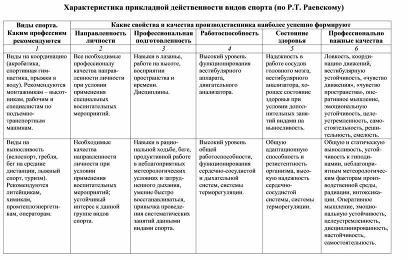 Характеристика прикладной действенности видов спорта (по Р.Т. Раевскому)