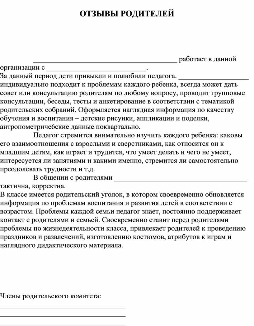 ____________________________ принимает активное участие в жизни __________________________, в педсоветах, семинарах, творческих группах. Была участницей конкурса «__________________» и заняла призовое место. Среди родителей и коллег пользуется уважением. По характеру коммуникабельная, отзывчивая, добрая. Требовательна к себе, детям и родителям.