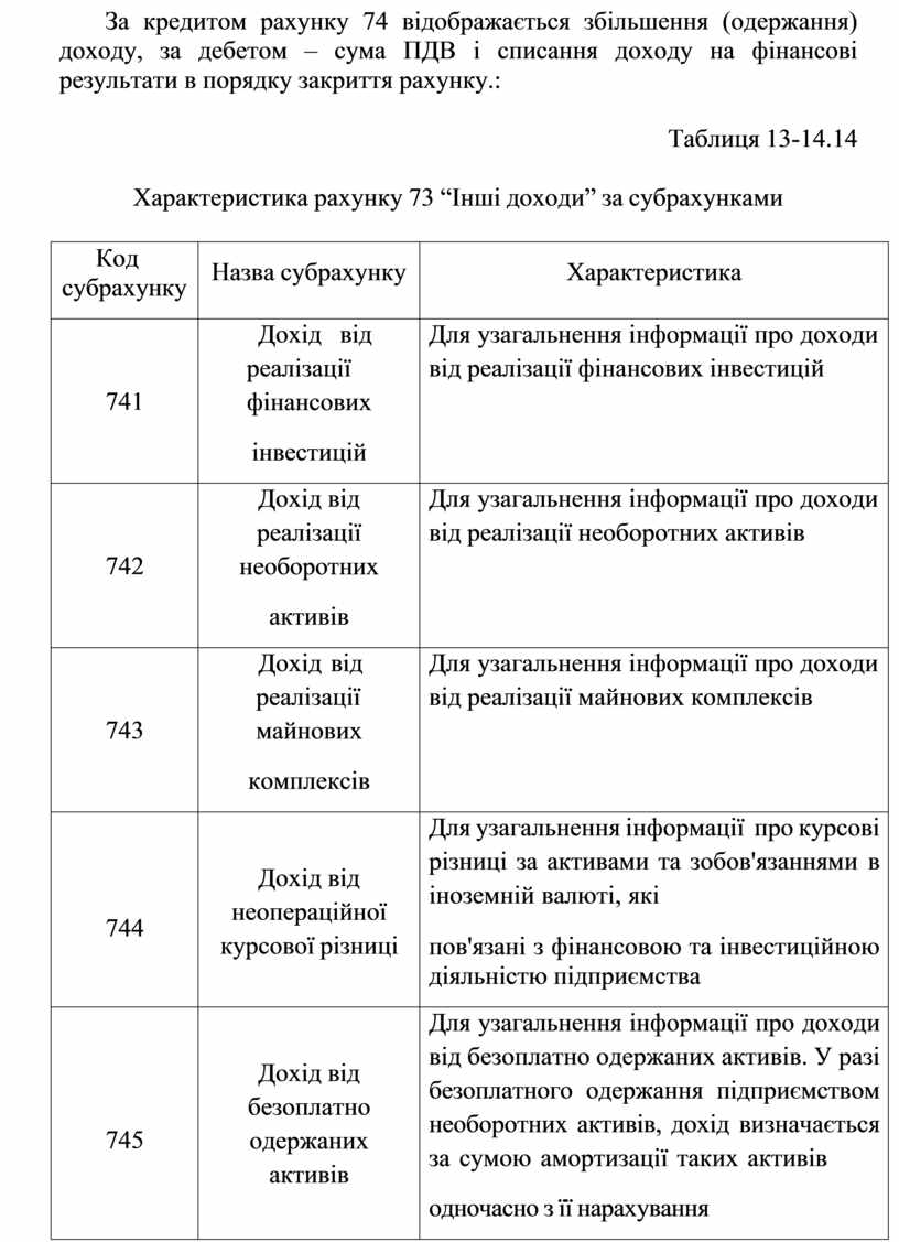 Для обліку доходів, які виникають в процесі звичайної діяльності, але не пов’язані з операційного та фінансовою діяльністю підприємства призначено пасивний рахунок 74 “Інші доходи” (таблиця 13-14.14).
