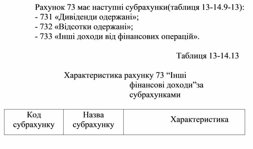 Рахунок 73 має наступні субрахунки(таблиця 13-14.9-13):