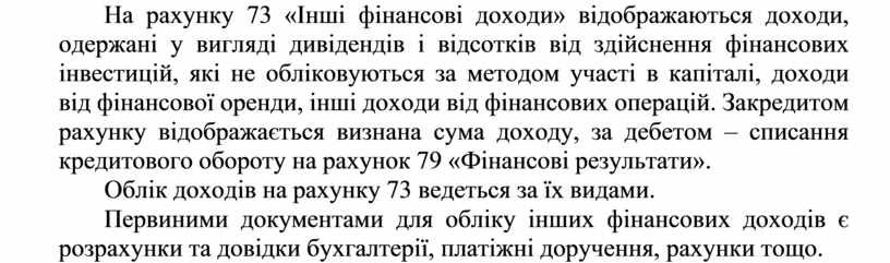 На рахунку 73 «Інші фінансові доходи» відображаються доходи, одержані у вигляді дивідендів і відсотків від здійснення фінансових інвестицій, які не обліковуються за методом участі в капіталі, доходи від фінансової оренди, інші доходи від фінансових операцій. За кредитом рахунку відображається визнана сума доходу, за дебетом – списання кредитового обороту на рахунок 79 «Фінансові результати».