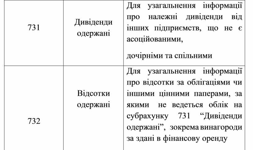 - 731 «Дивіденди одержані»;