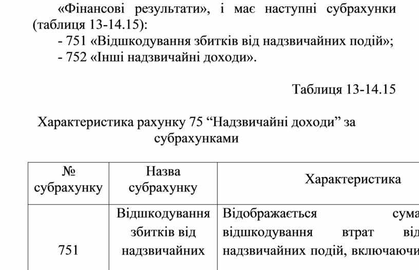 Характеристика рахунку 75 “Надзвичайні доходи” за субрахунками