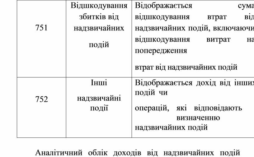 - 751 «Відшкодування збитків від надзвичайних подій»;
