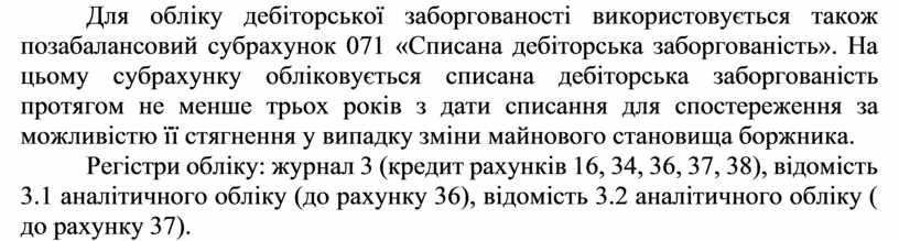 Для обліку дебіторської заборгованості використовується також позабалансовий субрахунок 071 «Списана дебіторська заборгованість». На цьому субрахунку обліковується списана дебіторська заборгованість протягом не менше трьох років з дати списання для спостереження за можливістю її стягнення у випадку зміни майнового становища боржника.