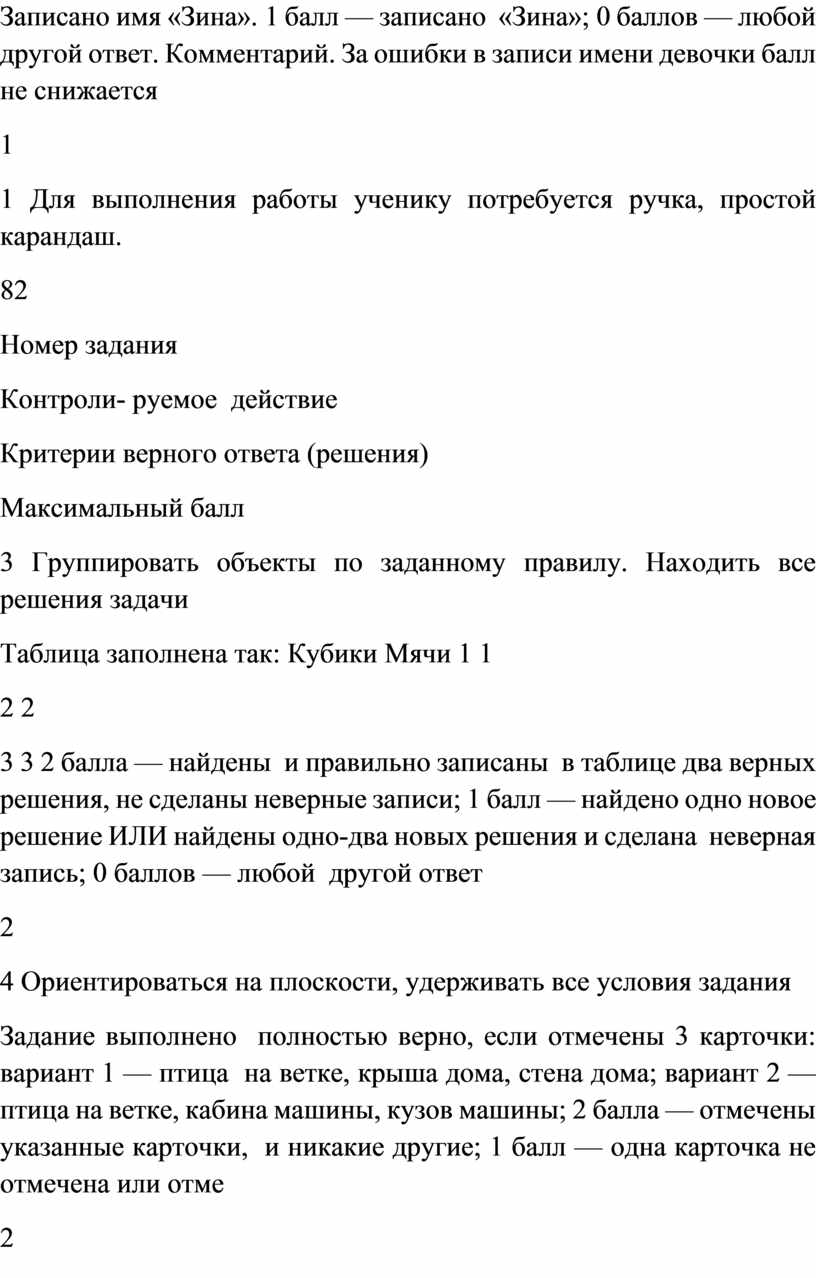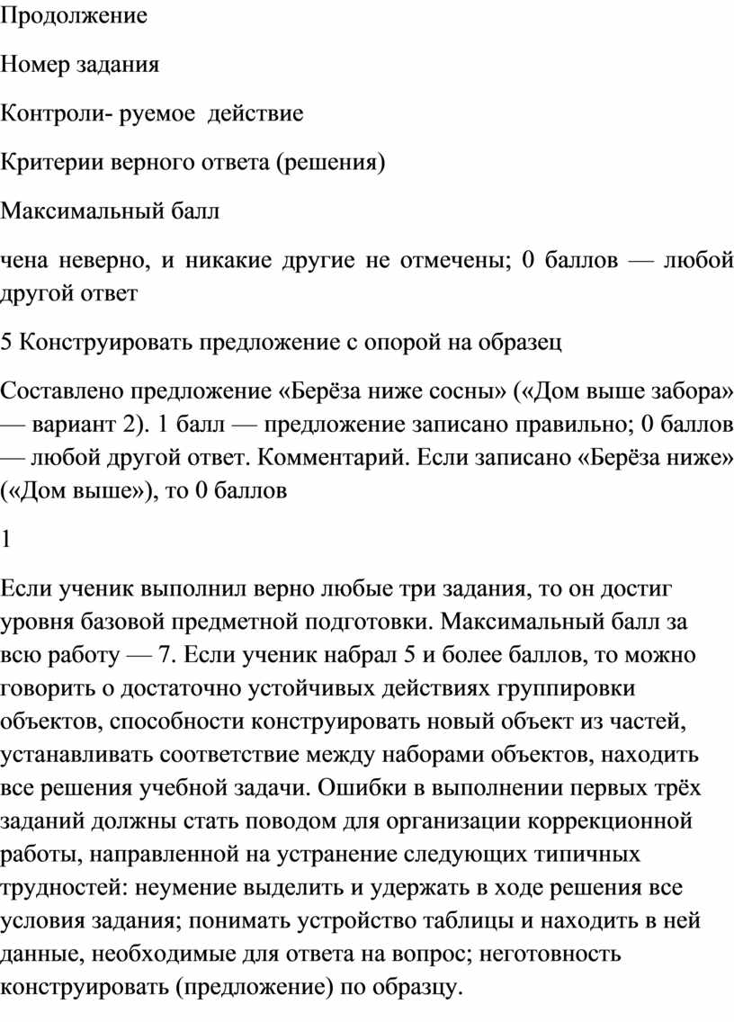Если ученик выполнил верно любые три задания, то он достиг уровня базовой предметной подготовки. Максимальный балл за всю работу — 7. Если ученик набрал 5 и более баллов, то можно говорить о достаточно устойчивых действиях группировки объектов, способности конструировать новый объект из частей, устанавливать соответствие между наборами объектов, находить все решения учебной задачи. Ошибки в выполнении первых трёх заданий должны стать поводом для организации коррекционной работы, направленной на устранение следующих типичных трудностей: неумение выделить и удержать в ходе решения все условия задания; понимать устройство таблицы и находить в ней данные, необходимые для ответа на вопрос; неготовность конструировать (предложение) по образцу.