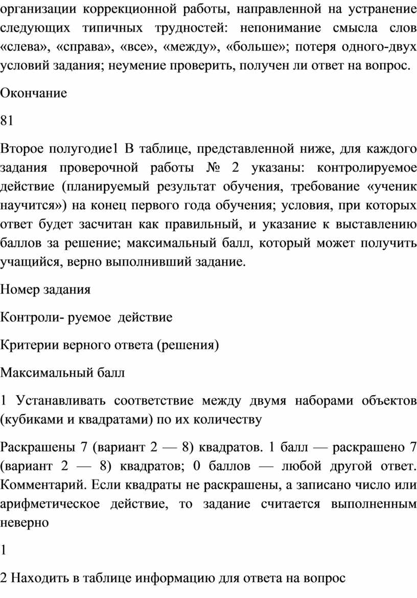 Второе полугодие1 В таблице, представленной ниже, для каждого задания проверочной работы № 2 указаны: контролируемое действие (планируемый результат обучения, требование «ученик научится») на конец первого года обучения; условия, при которых ответ будет засчитан как правильный, и указание к выставлению баллов за решение; максимальный балл, который может получить учащийся, верно выполнивший задание.