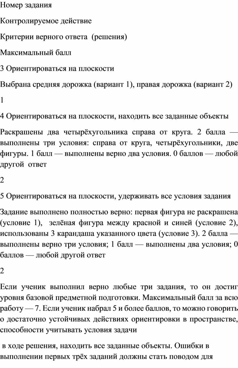 Если ученик выполнил верно любые три задания, то он достиг уровня базовой предметной подготовки. Максимальный балл за всю работу — 7. Если ученик набрал 5 и более баллов, то можно говорить о достаточно устойчивых действиях ориентировки в пространстве, способности учитывать условия задачи