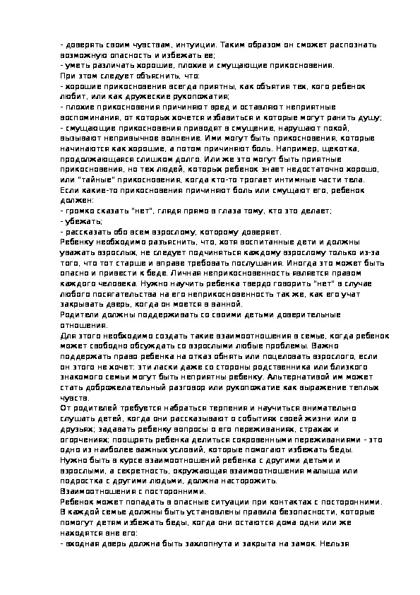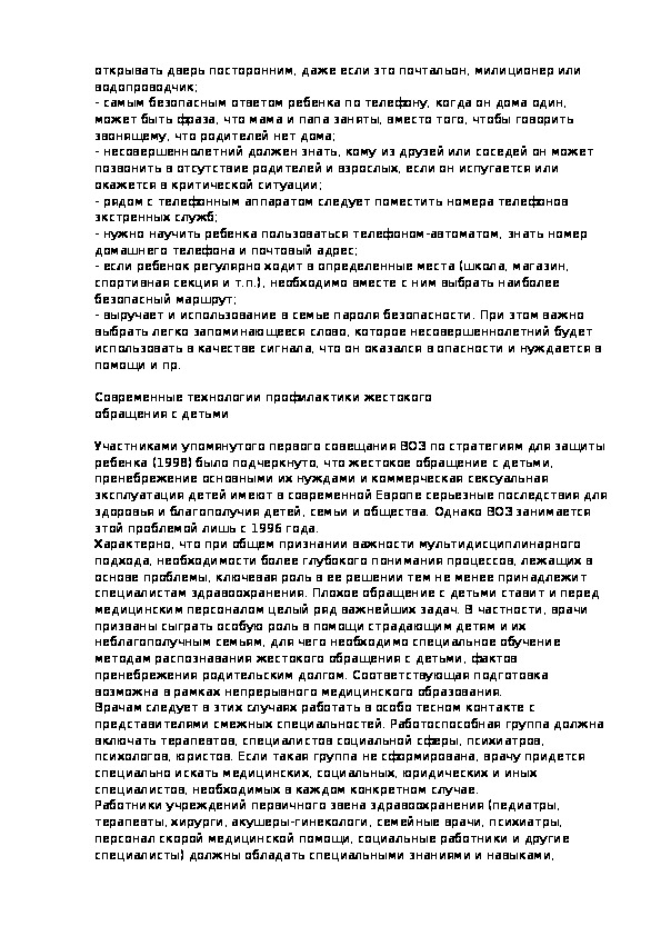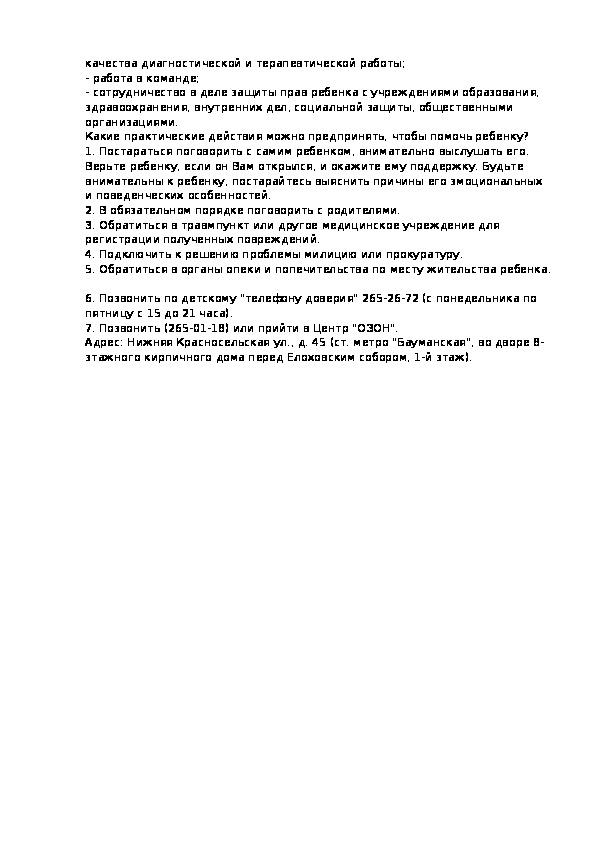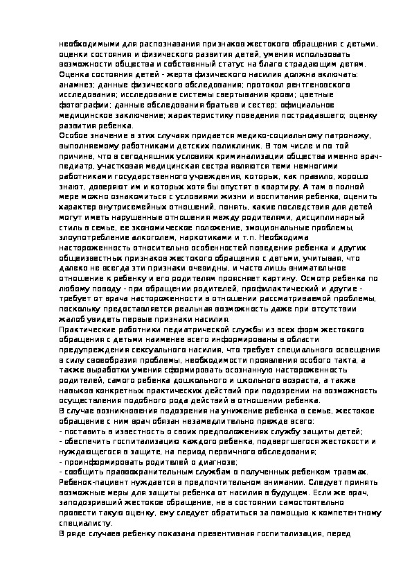 Практические работники органов здравоохранения, образования, социальной защиты населения в целях принятия в своей повседневной деятельности адекватных эффективных мер защиты прав ребенка должны иметь представление о наиболее часто встречающихся формах насилия над ребенком, диагностических признаках, реальных путях предотвращения насилия в отношении детей и, в конечном счете, содействовать своими практическими действиями укреплению института семьи.
