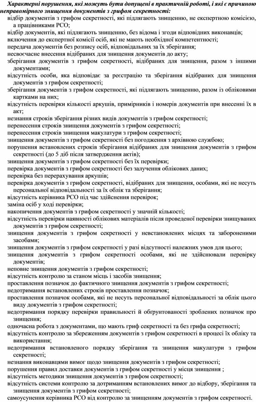 Характерні порушення, які можуть бути допущені в практичній роботі, і які є причиною неправомірного знищення документів з грифом секретності: