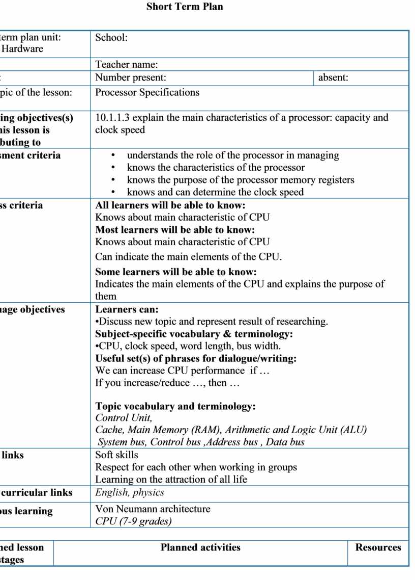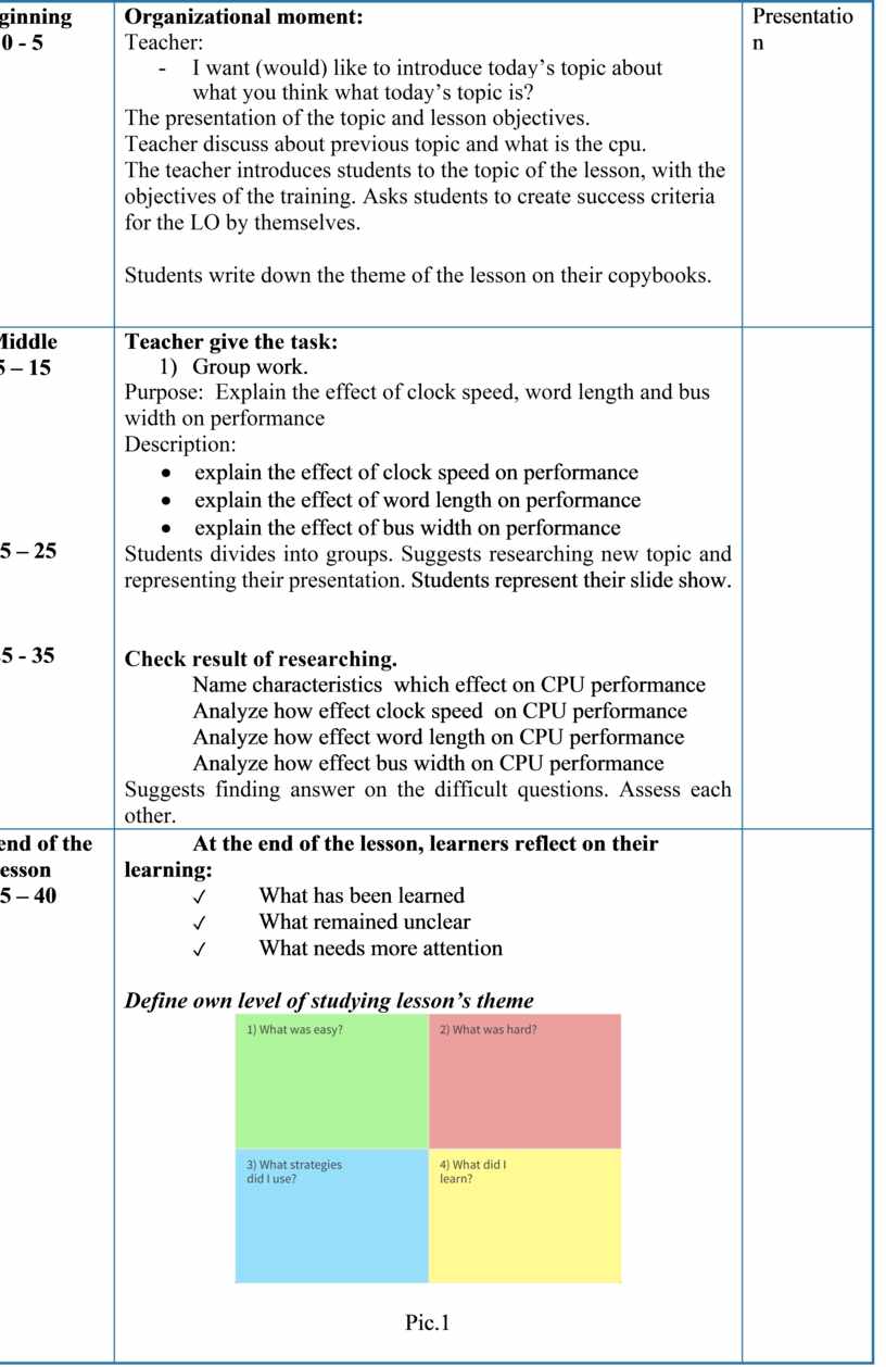 Organizational moment: Teacher: - I want (would) like to introduce today’s topic about …/ what you think what today’s topic is? The presentation of the topic and lesson objectives. Teacher discuss about previous topic and what is the cpu. The teacher introduces students to the topic of the lesson, with the objectives of the training. Asks students to create success criteria for the LO by themselves. Students write down the theme of the lesson on their copybooks. |