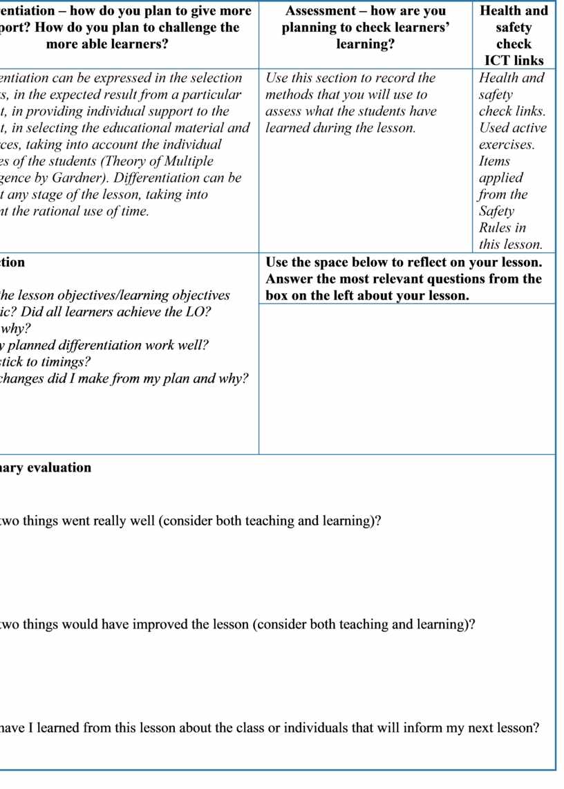 Were the lesson objectives/learning objectives realistic? Did all learners achieve the LO? If not, why? Did my planned differentiation work well? Did I stick to timings? What changes did I make from my plan and why?