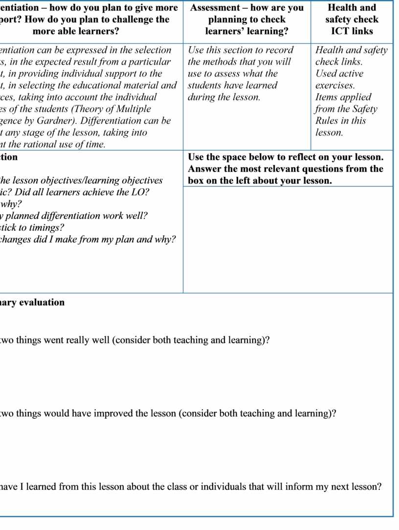 Were the lesson objectives/learning objectives realistic? Did all learners achieve the LO? If not, why? Did my planned differentiation work well? Did I stick to timings? What changes did I make from my plan and why?
