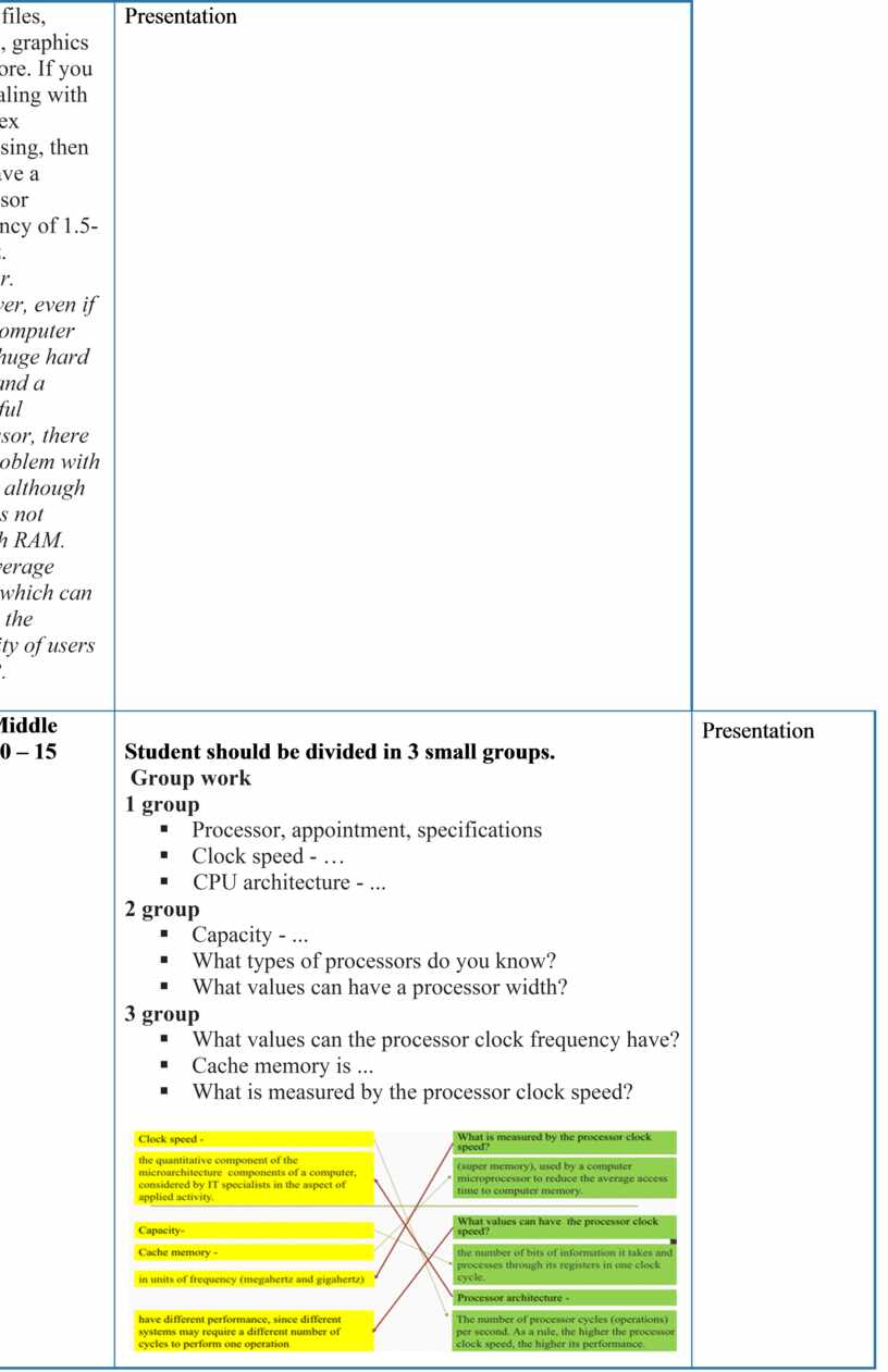 2 group § Capacity - ... § What types of processors do you know? § What values can have a processor width? 3 group § What values can the processor clock frequency have? § Cache memory is ... § What is measured by the processor clock speed?