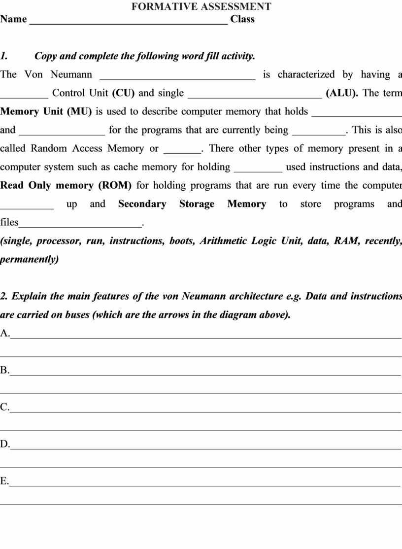 The Von Neumann _____________________________ is characterized by having a _________ Control Unit (CU) and single _________________________ (ALU). The term Memory Unit (MU) is used to describe computer memory that holds _________________ and ________________ for the programs that are currently being __________. This is also called Random Access Memory or _______. There other types of memory present in a computer system such as cache memory for holding _________ used instructions and data, Read Only memory (ROM) for holding programs that are run every time the computer __________ up and Secondary Storage Memory to store programs and files_______________________.