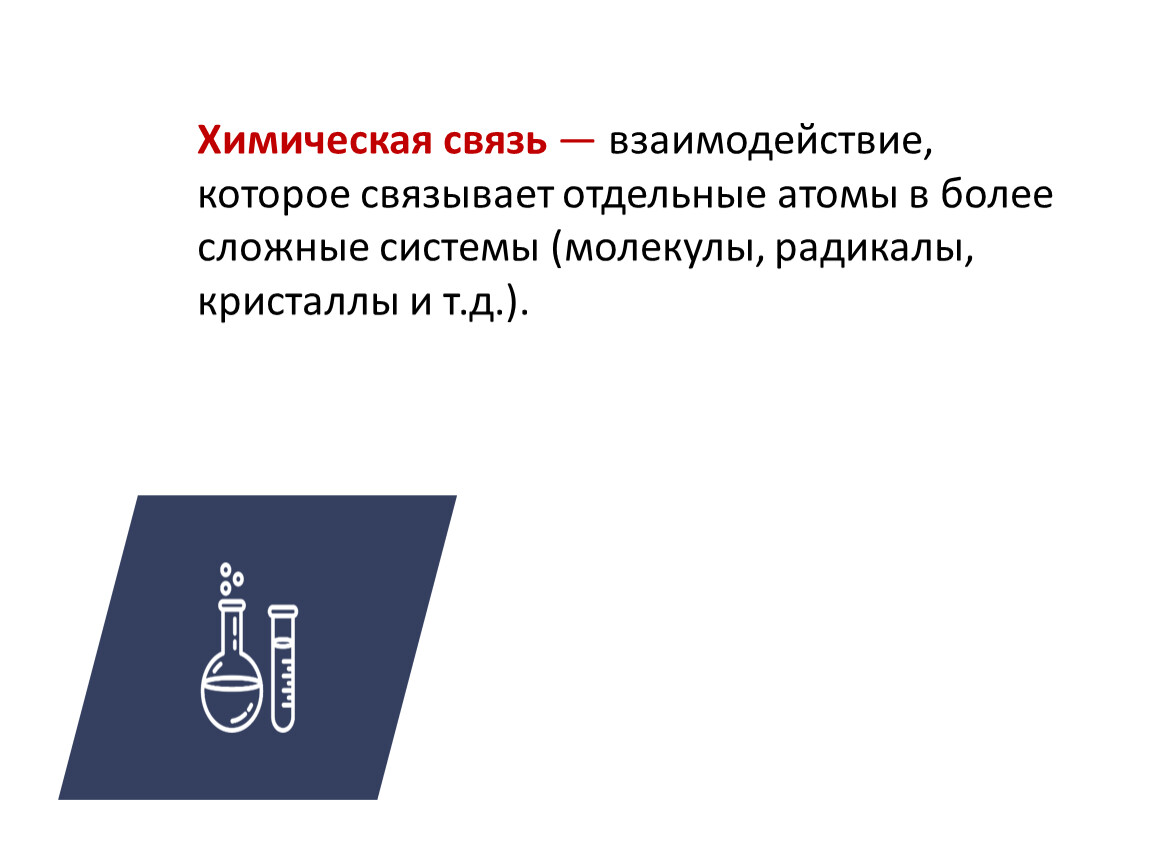 Химическая связь — взаимодействие, которое связывает отдельные атомы в более сложные системы (молекулы, радикалы, кристаллы и т.д.).