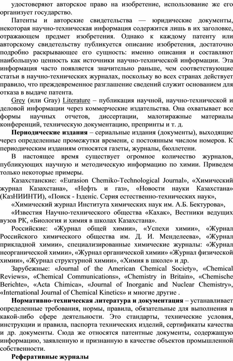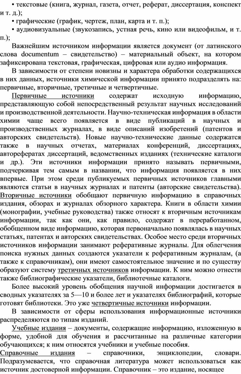 Первичные источники содержат исходную информацию, представляющую собой непосредственный результат научных исследований и производственной деятельности. Научно-техническая информация в области химии чаще всего появляется в виде публикаций в научных и производственных журналах, в виде описаний изобретений (патентов и авторских свидетельств). Новые научно-технические данные содержатся также в научных отчетах, материалах конференций, диссертациях, авторефератах диссертаций, ведомственных изданиях (технические каталоги и др.). Эти источники информации принято называть первичными, подчеркивая тем самым в названии, что информация появляется в них впервые. При этом среди публикуемых первичных источников главными являются статьи в научных журналах и патенты (авторские свидетельства). Вторичные источники обобщают первичную информацию в справочных издания, обзорах и журналах обзорного характера. Книги в области химии (монографии, учебные руководства) также относят к вторичным источникам информации, так как они, как правило, содержат в переработанном, обобщенном виде информацию, которая первоначально появлялась в научных статьях, патентах и авторских свидетельствах. Особое место среди вторичных источников информации занимают реферативные журналы. Для облегчения поиска нужных данных создаются указатели к реферативным журналам, (а также к справочникам), они имеют самостоятельное значение и по существу образуют систему третичных источников информации. К ним можно отнести также библиографические указатели, библиотечные каталоги.