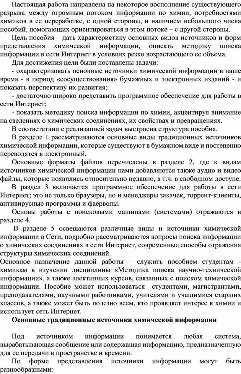 Цель пособия – дать характеристику основных видов источников и форм представления химической информации, описать методику поиска информации в сети Интернет в условиях резко возрастающего ее объема.