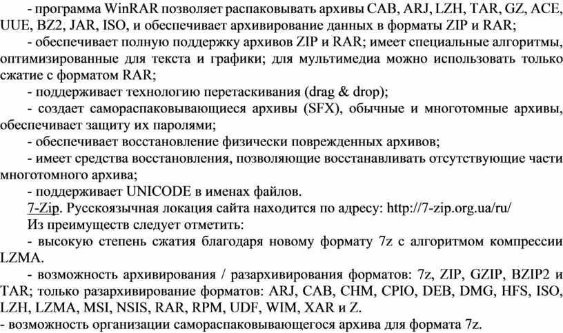 - программа WinRAR позволяет распаковывать архивы CAB, ARJ, LZH, TAR, GZ, ACE, UUE, BZ2, JAR, ISO, и обеспечивает архивирование данных в форматы ZIP и RAR;