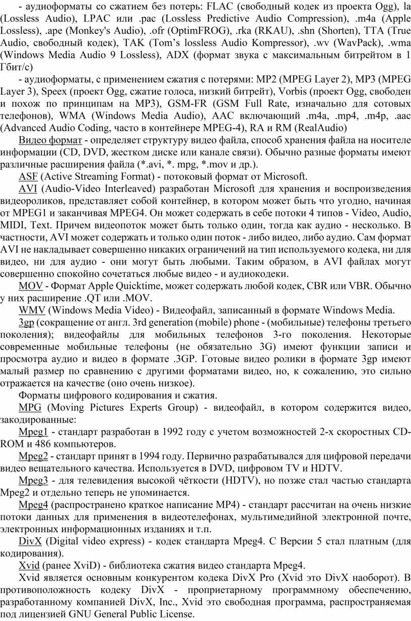 Видео формат - определяет структуру видео файла, способ хранения файла на носителе информации (CD, DVD, жестком диске или канале связи). Обычно разные форматы имеют различные расширения файла (*.avi, *. mpg, *.mov и др.).