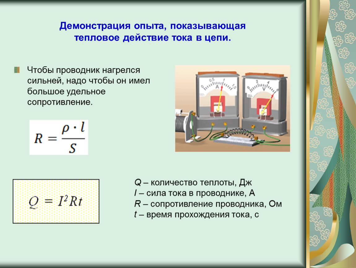 Q – количество теплоты, Дж I – сила тока в проводнике, А R – сопротивление проводника, Ом t – время прохождения тока, с