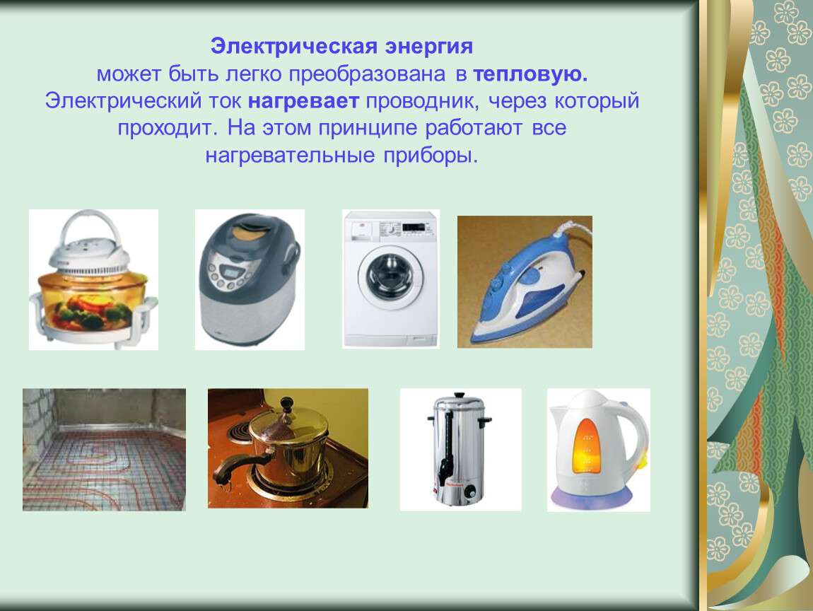 Электрическая энергия может быть легко преобразована в тепловую. Электрический ток нагревает проводник, через который проходит. На этом принципе работают все нагревательные приборы.