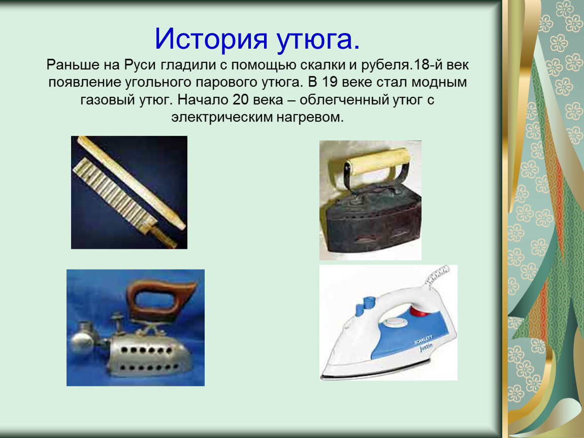 История утюга. Раньше на Руси гладили с помощью скалки и рубеля.18-й век появление угольного парового утюга. В 19 веке стал модным газовый утюг. Начало 20 века – облегченный утюг с электрическим нагревом.