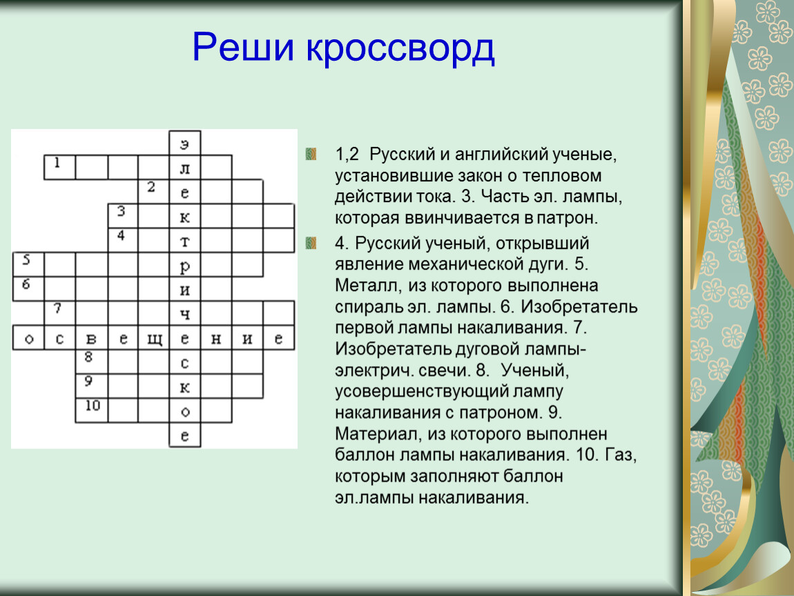 1-Джоуль. 2- Ленц. 3 - цоколь. 4 -Петров. 5 - вольфрам. 6 – Лодыгин. 7 – Яблочков. 8 – Эдисон. 9 – стекло. 10 – аргон.