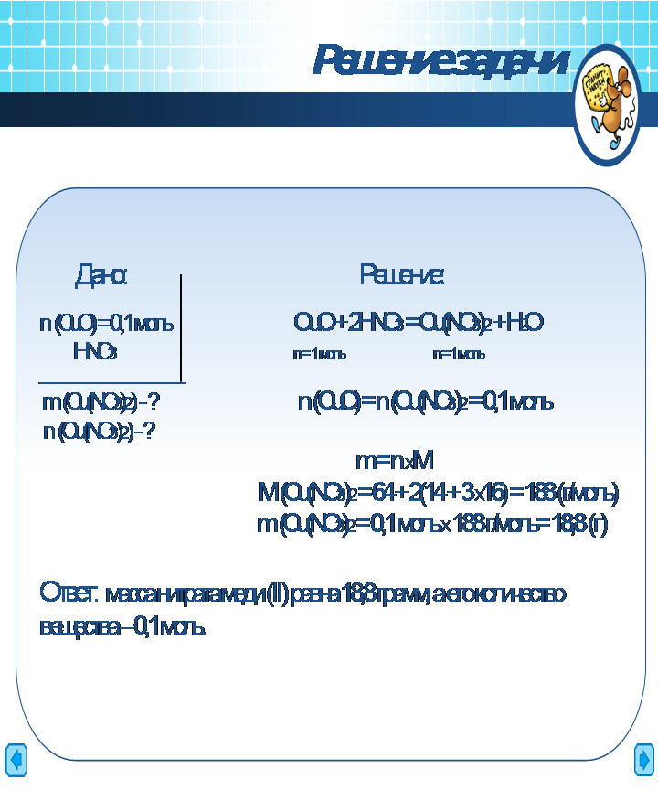 Ответ: масса нитрата меди (II) равна 18,8 грамм, а его количество вещества – 0,1 моль.