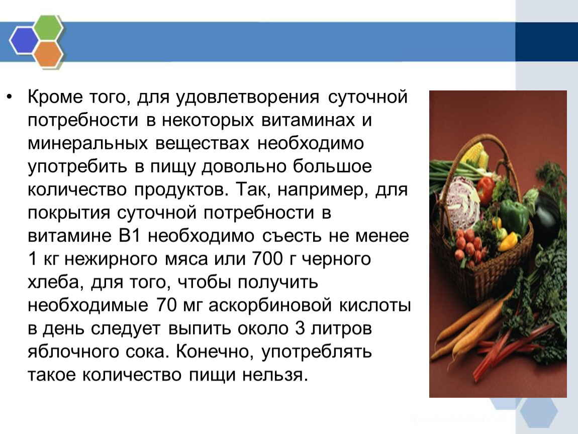 Кроме того, для удовлетворения суточной потребности в некоторых витаминах и минеральных веществах необходимо употребить в пищу довольно большое количество продуктов. Так, например, для покрытия суточной потребности в витамине В1 необходимо съесть не менее 1 кг нежирного мяса или 700 г черного хлеба, для того, чтобы получить необходимые 70 мг аскорбиновой кислоты в день следует выпить около 3 литров яблочного сока. Конечно, употреблять такое количество пищи нельзя.