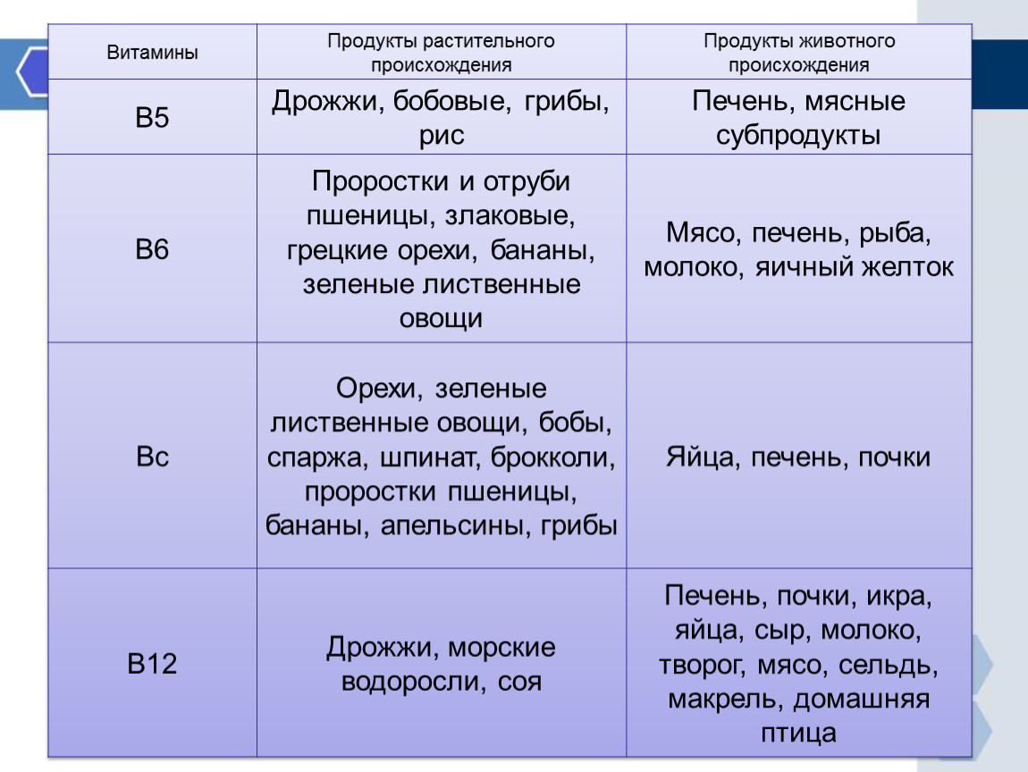 B5 | Дрожжи, бобовые, грибы, рис | Печень, мясные субпродукты |