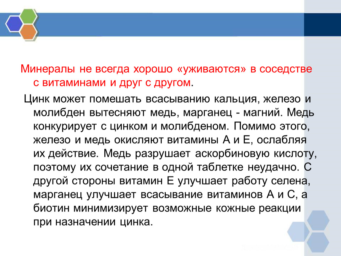 Цинк может помешать всасыванию кальция, железо и молибден вытесняют медь, марганец - магний. Медь конкурирует с цинком и молибденом. Помимо этого, железо и медь окисляют витамины А и Е, ослабляя их действие. Медь разрушает аскорбиновую кислоту, поэтому их сочетание в одной таблетке неудачно. С другой стороны витамин Е улучшает работу селена, марганец улучшает всасывание витаминов А и С, а биотин минимизирует возможные кожные реакции при назначении цинка.