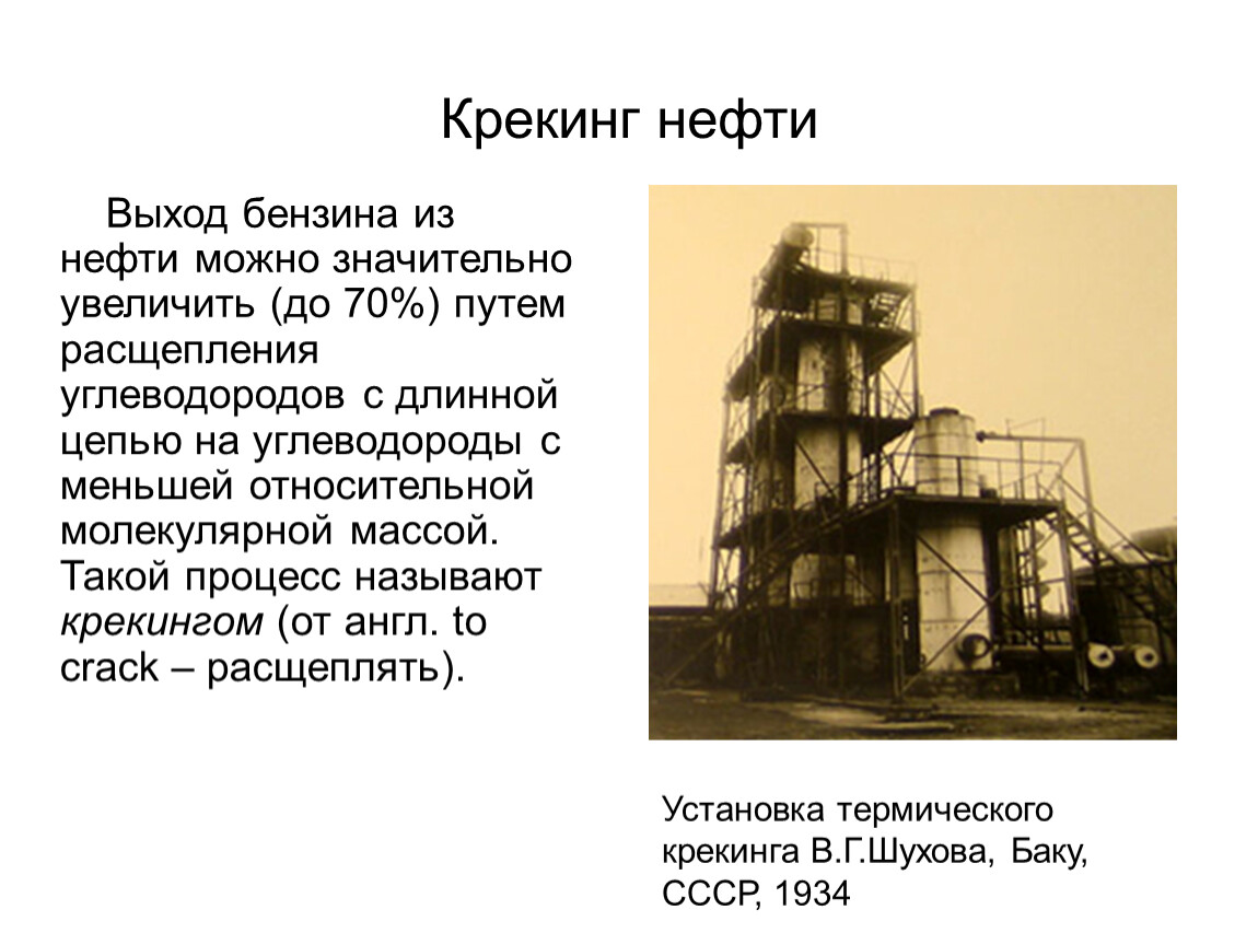 Выход бензина из нефти можно значительно увеличить (до 70%) путем расщепления углеводородов с длинной цепью на углеводороды с меньшей относительной молекулярной массой. Такой процесс называют крекингом (от англ. to crack – расщеплять).
