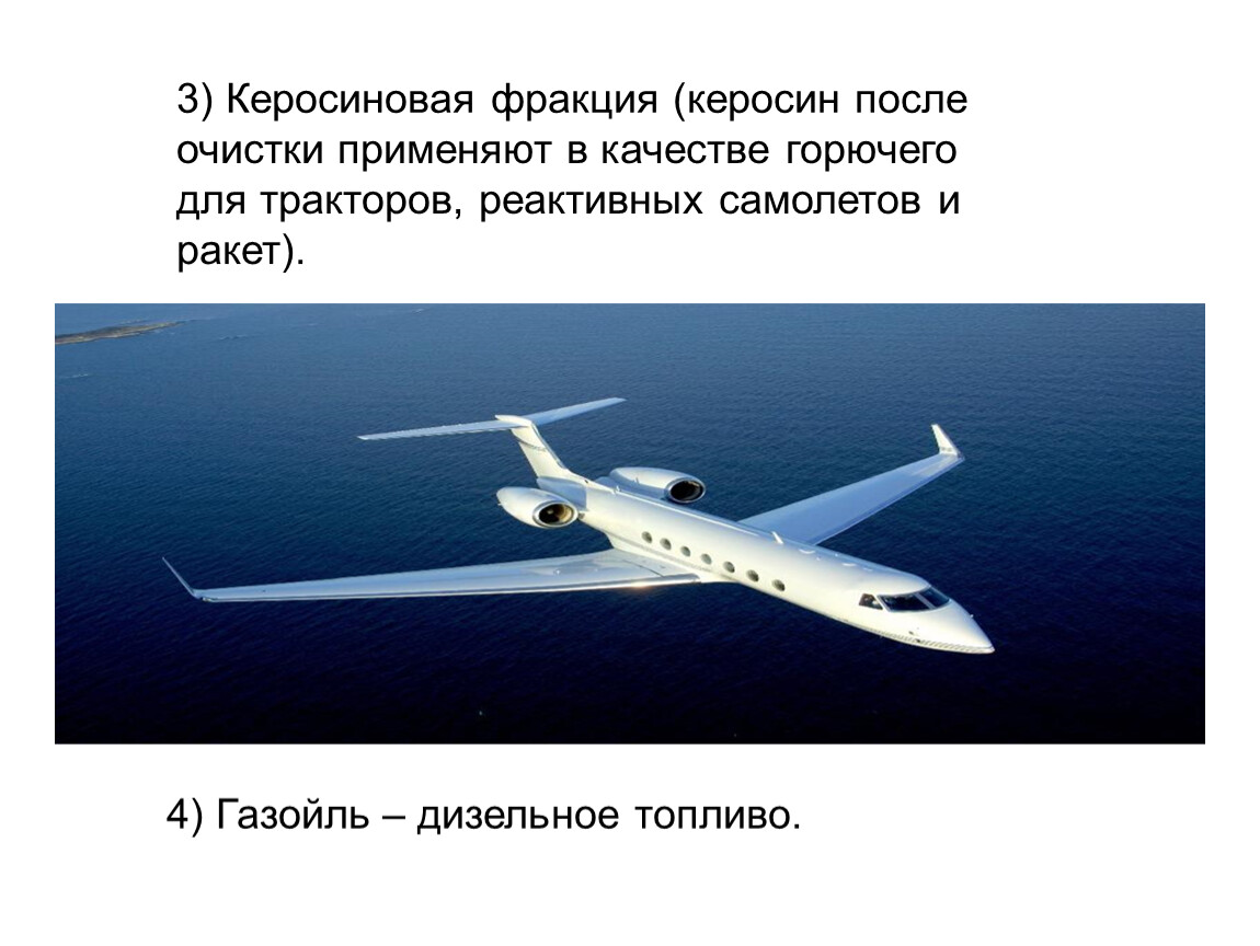 3) Керосиновая фракция (керосин после очистки применяют в качестве горючего для тракторов, реактивных самолетов и ракет).