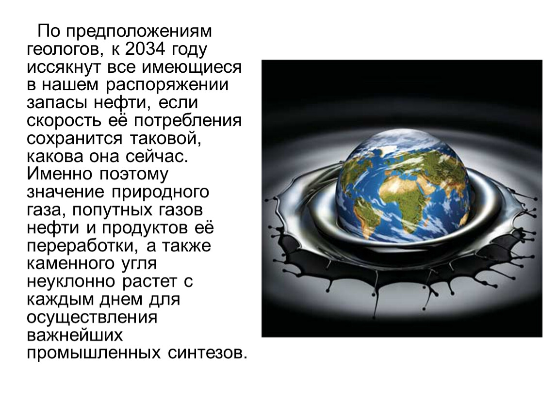 По предположениям геологов, к 2034 году иссякнут все имеющиеся в нашем распоряжении запасы нефти, если скорость её потребления сохранится таковой, какова она сейчас. Именно поэтому значение природного газа, попутных газов нефти и продуктов её переработки, а также каменного угля неуклонно растет с каждым днем для осуществления важнейших промышленных синтезов.