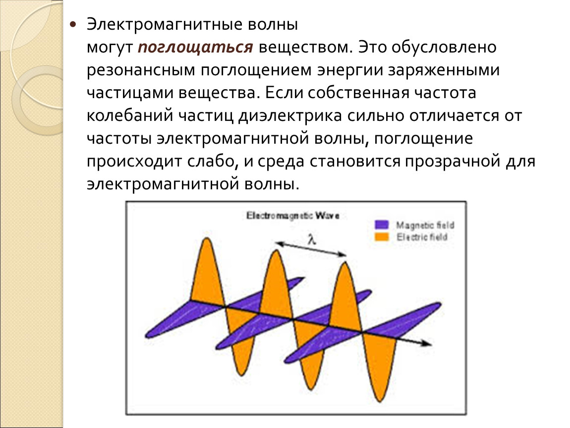 Электромагнитные волны могут поглощаться веществом. Это обусловлено резонансным поглощением энергии заряженными частицами вещества. Если собственная частота колебаний частиц диэлектрика сильно отличается от частоты электромагнитной волны, поглощение происходит слабо, и среда становится прозрачной для электромагнитной волны.