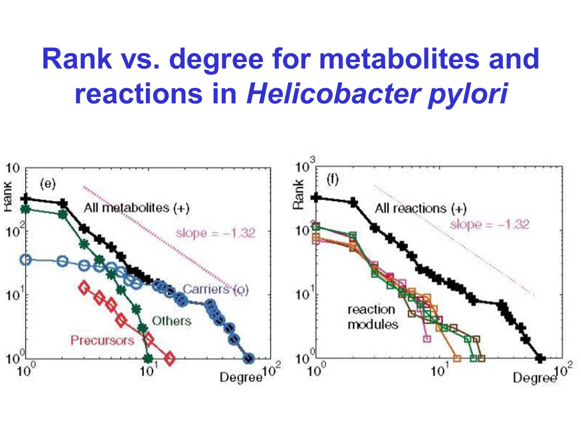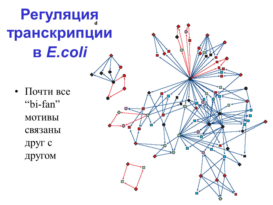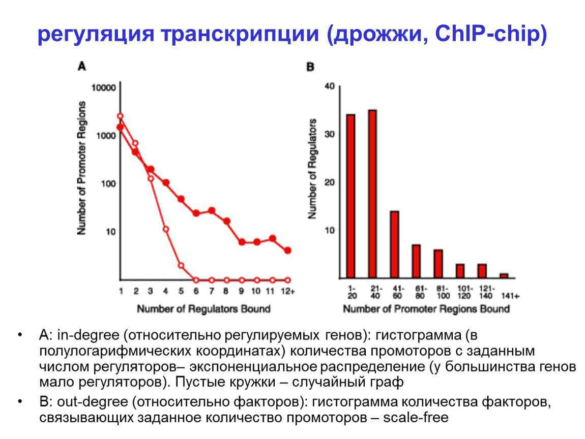 A: in-degree (относительно регулируемых генов): гистограмма (в полулогарифмических координатах) количества промоторов с заданным числом регуляторов– экспоненциальное распределение (у большинства генов мало регуляторов). Пустые кружки – случайный граф